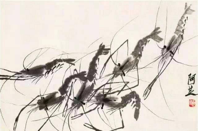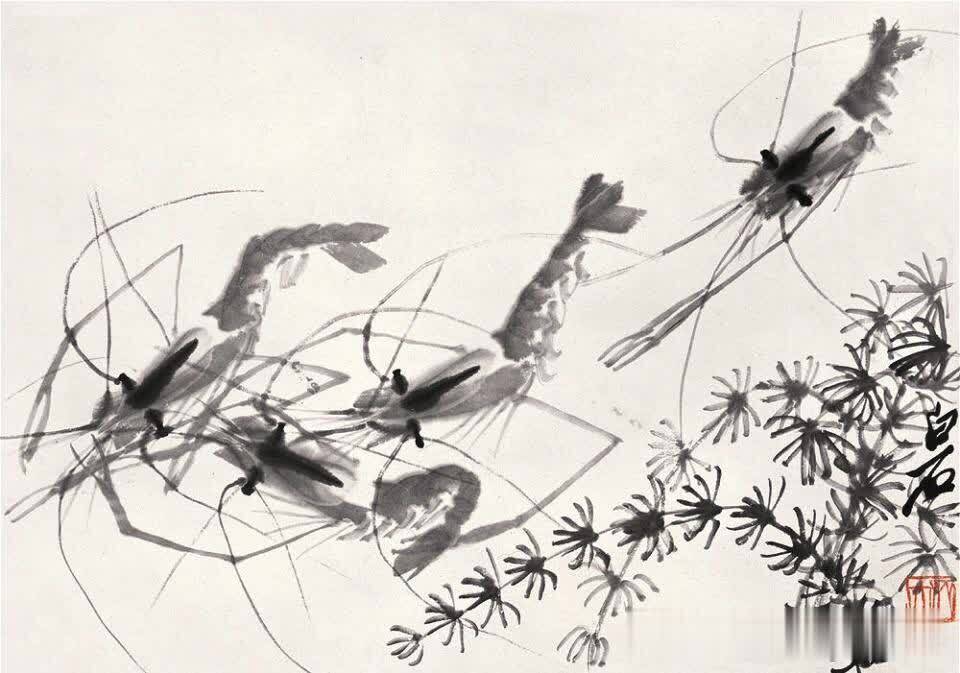 看过齐白石画虾的视频,只见他拿出一张小宣纸,把墨调匀,再舀出一小勺清水,滴入笔头和根部。然后笔尖向左,让笔头与桌面形成一个四十度角,用力一按,因根部已被清水给冲淡了,纸上便出现了一个极淡的圆点,在圆点的右下角补上一笔,大半压住前一笔,小部分露在外面,一个虾头就形成了,顺手在两侧各点了一下,接下来画虾身,一笔一节,一节套一节,以向上隆起的形状画五六节,再趁势向前一拉,又侧着笔上下两抹,虾尾就画好了。接着添上足和螯,再用浓墨画上虾眼,又在背部点了一下。然后,换成小笔画虾须,从虾头的前部向后撇了几条长须,一个大虾就画好了,前后还不到一分钟。