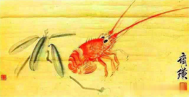但是画面上这只腹部向里曲卷,弓着身子的大龙虾还却是一副活着的样子,头是昂着,眼睛平视前方,一对长触角像两把利剑高高耸立,甚是趾高气昂,一只死虾哪里来这么神气。所以,我们只能把齐白石画的这只大龙虾,看成是他绘画的最高境界,能把死的都画成活的。