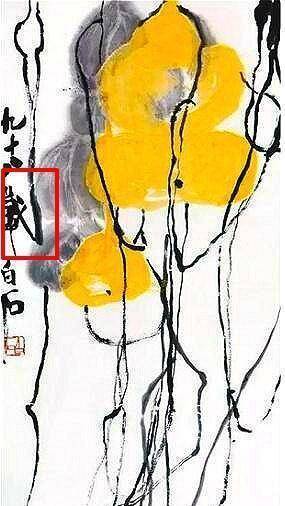 齐白石晚年,人老了画画有时会出差错,比如他画了一幅葫芦,在落款的时候,本来很熟悉的“岁”字的繁体字“歳”,写到下半部分突然不会写了,好在回味过来,立马改了,但也留下修改的痕迹(见下图)。但是,他画这只红虾,为什么要在大龙虾的头里画一个小鬼?网再怎么着,那也是在虾头里面,真不知道这样画,他是想告诉世人什么?这个问题真的很费解。不知你怎么看这个问题,欢迎发表看法。