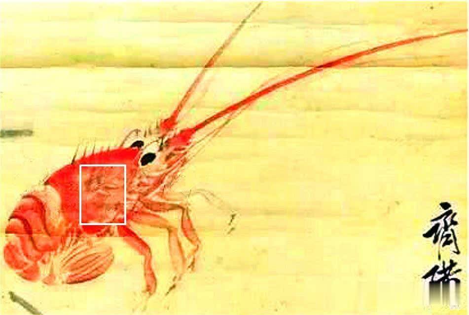 这幅画放大28倍(见图一),齐白石不仅把这只红的大龙虾的头,画成了透明的,而且细看,透明的虾头里,还有东西。这么大的龙虾,头里肯定是一大块红膏了,一般的大虾这个季节吃,都会有红膏。但是,根本不是这么回事,虾头里好像是一幅小画,刚开始,我以为是眼睛看花了,再细看,里面确实画了一个小孩。很多网友看了,吓了一跳,这不是一个小鬼吗?见图一白框里所示,这个面目全非的小鬼,一双手正横着指向一个地方,是想告诉你,那里有什么东西,还是有什么事情发生。