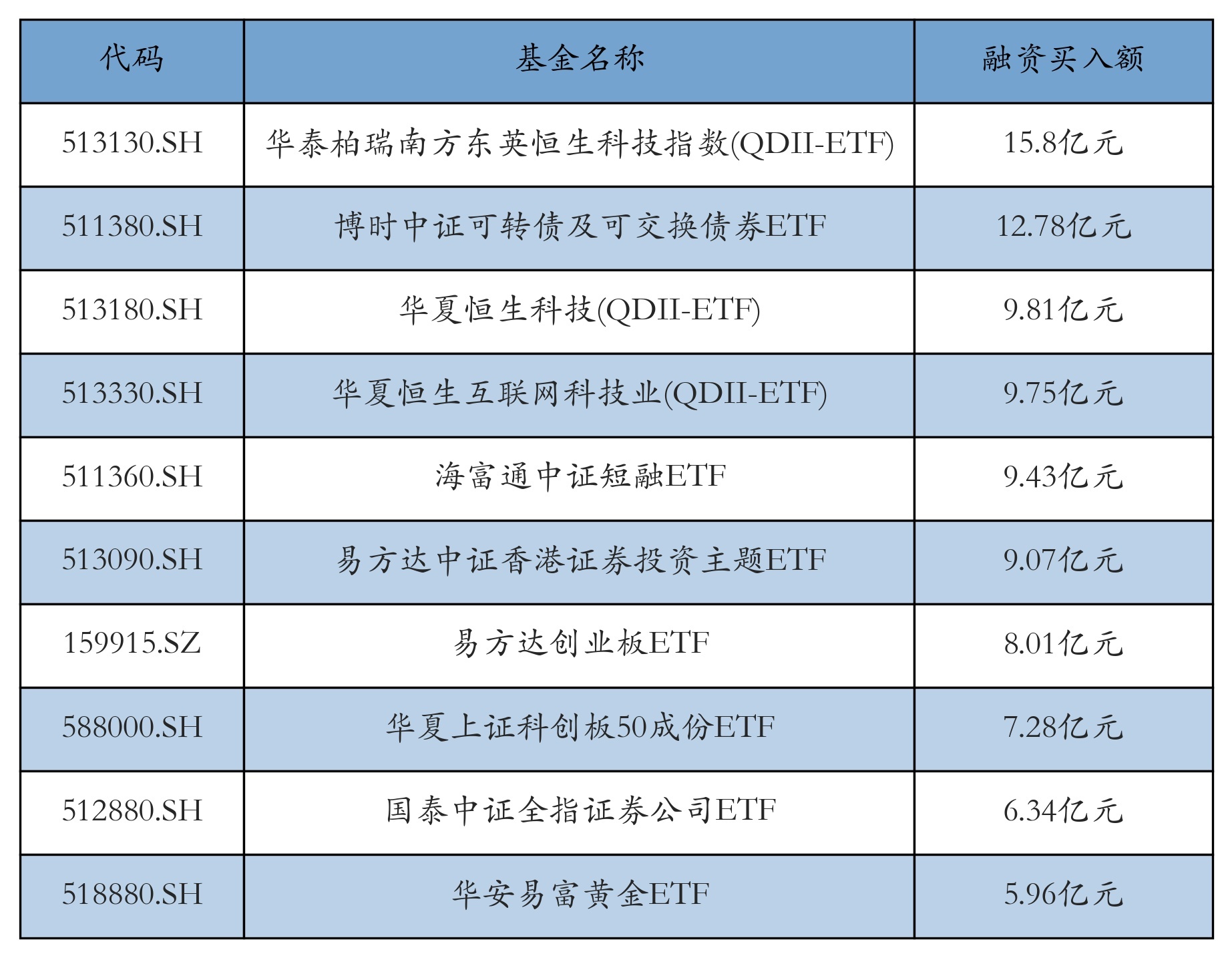 11月21日ETF融资买入额前三位分别为:华泰柏瑞南方东英恒生科技指数(QDII-ETF)(15.8亿元)、博时中证可转债及可交换债券ETF(12.78亿元)和华夏恒生科技(QDII-ETF)(9.81亿元),前10具体见下表: