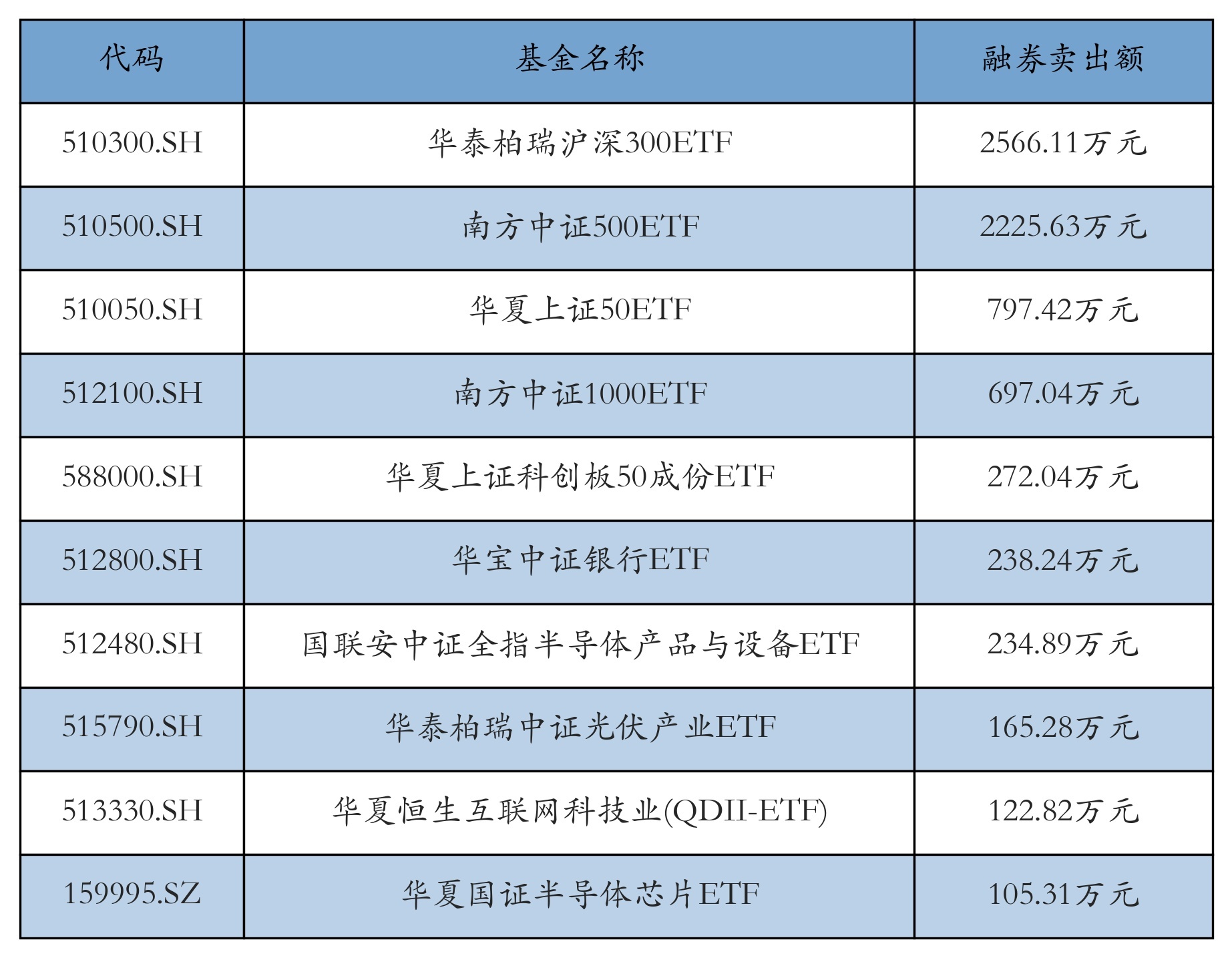 11月21日ETF融券卖出额前三位分别为:华泰柏瑞沪深300ETF(2566.11万元)、南方中证500ETF(2225.63万元)和华夏上证50ETF(797.42万元),前10具体见下表: