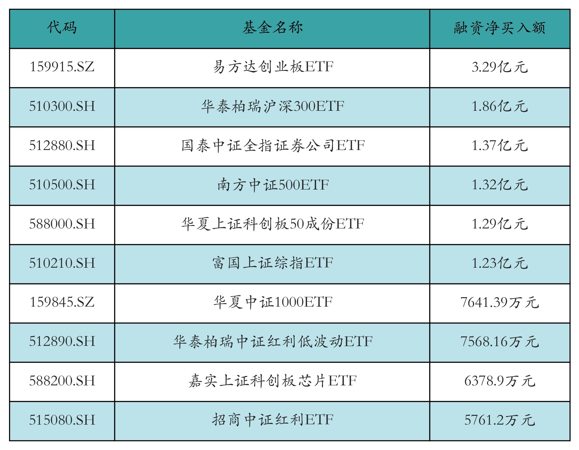 11月21日ETF融资净买入额前三位分别为:易方达创业板ETF(3.29亿元)、华泰柏瑞沪深300ETF(1.86亿元)和国泰中证全指证券公司ETF(1.37亿元),前10具体见下表:
